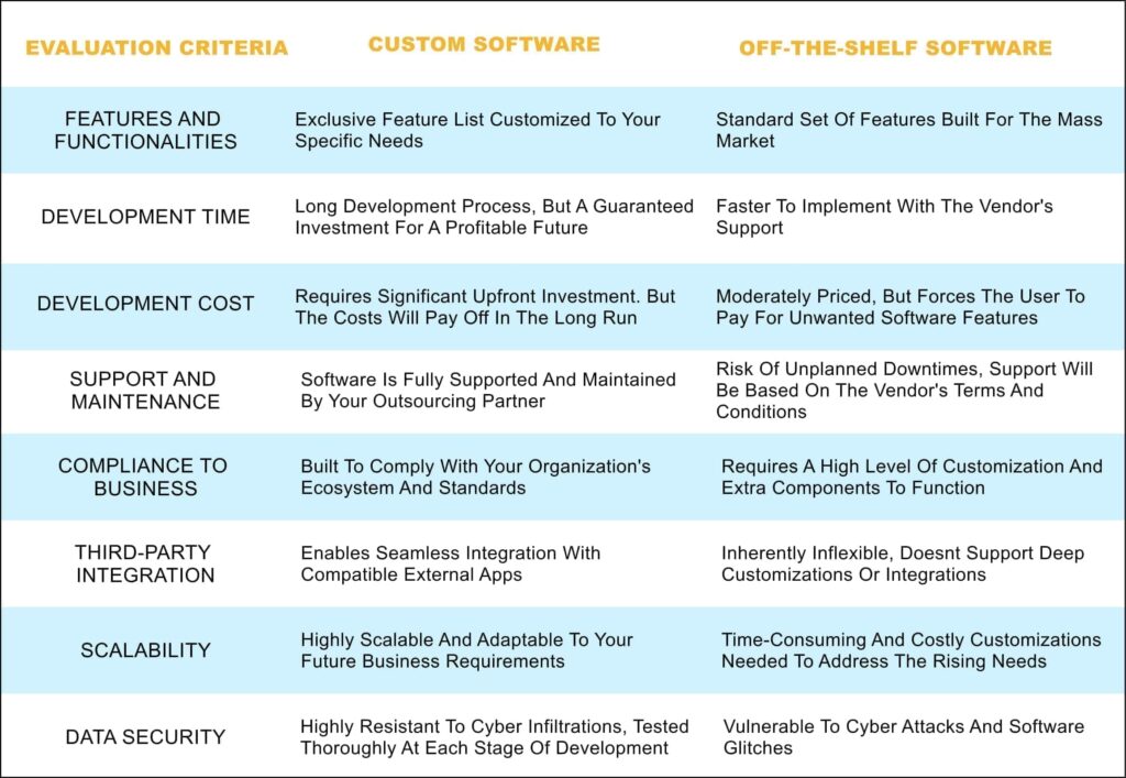 Here’s a quick comparison of custom software and off-the-shelf solutions to help you decide what’s best for your business: